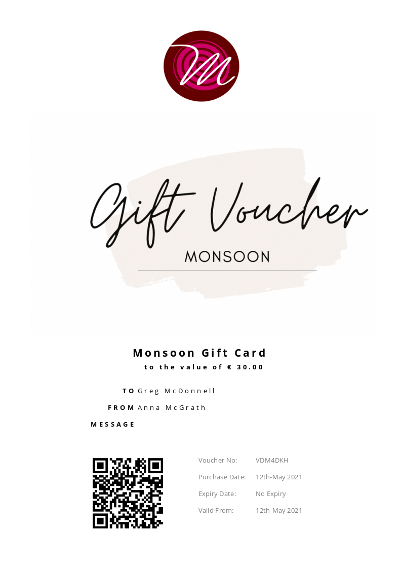 Monsoon allows you to purchase instantly printable gift vouchers, special offers and tickets using the Voucher Connect platform.